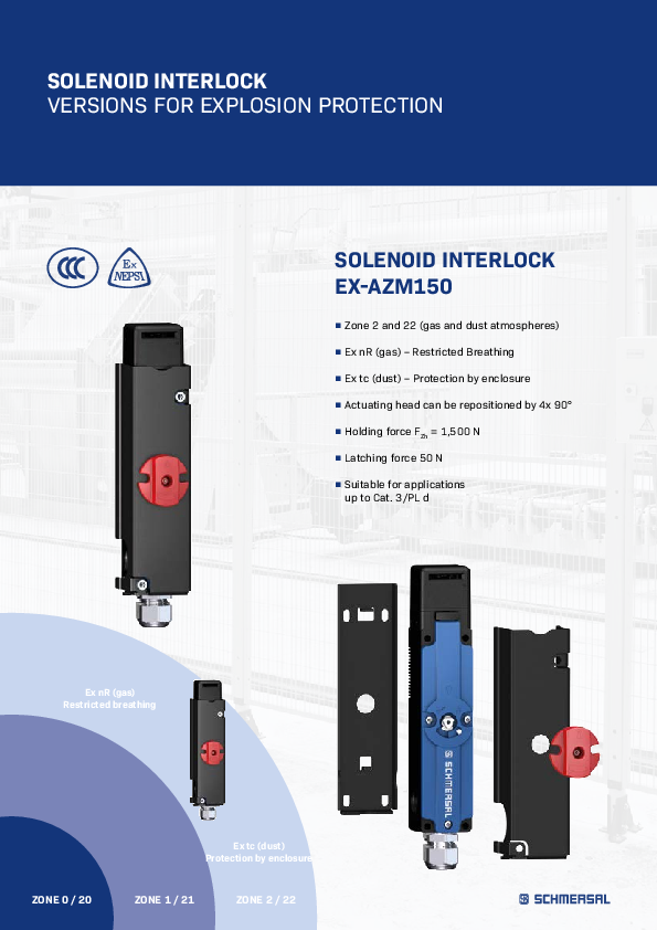 防爆型电磁安全锁 EX-AZM150 适用于2区和22区(气体与粉尘环境) 防爆类型Ex nR(气体)——限制呼吸 防爆类型Ex tc(粉尘)——外壳防护 操动头可进行4次90°定位调整 保持力 FZh = 1,500 N 锁定力 50 N 适用于最高 Cat. 3/PL d 类应用